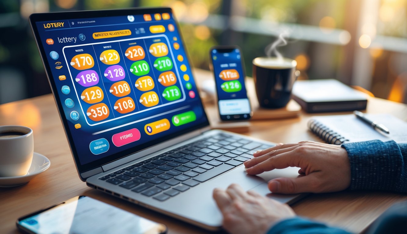 Meja kerja dengan laptop dan ponsel yang menampilkan aplikasi togel online, dengan secangkir kopi dan buku catatan di sekitar.