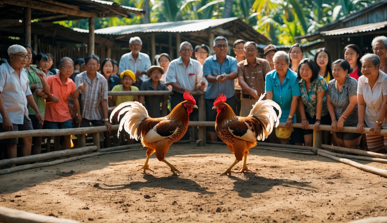 Dua ayam jago bertarung di arena kayu dengan penonton yang menonton di sekelilingnya di lingkungan pedesaan.