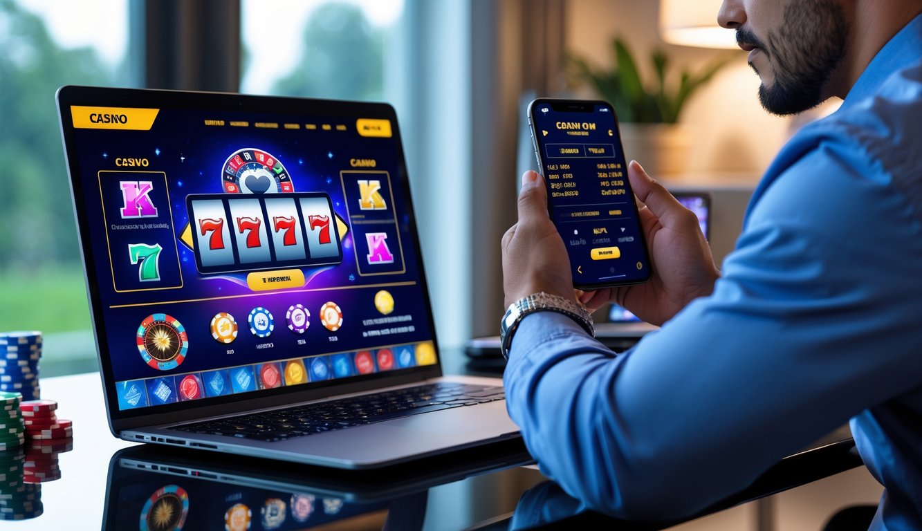 Seseorang duduk di depan laptop yang menampilkan situs kasino online dengan perangkat teknologi di ruang kerja modern.